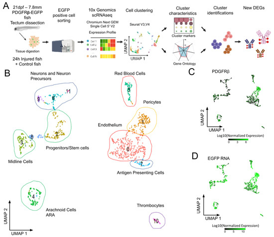 In this manuscript, we first focus on the cellular composition of the meninges of zebrafish (Danio rerio). The zebrafish model, with its considerable regenerative capacity, has made a major contribution to our understanding of the cellular and molecular mechanisms underlying organ regeneration. This model species has been particularly useful for studies of organs with limited regeneration potential in mammals, such as the heart [,,,] and nervous system [,]. We studied fish 21 days post-fertilization (dpf), because at this stage it is easy to dissect the brain, to analyze reasonably mature immune and nervous systems, and to perform rapid and easy three-dimensional (3D) imaging of the brain, which is not covered dorsally by a thick cranium as it is in adults. We followed the outcome of injury to the optic tectum (OT), as this large dorsal region of the brain is the easiest to image in live or fixed samples. We focused on cells expressing platelet-derived growth factor receptor beta (PDGFRβ), which is known to be expressed on pericytes playing a key role in blood vessel integrity, and in the lymphatic vasculature of the meninges []. We used an existing BAC-derived transgenic zebrafish line faithfully driving Gal4 expression in PDGFRβ-expressing cells []. We first used 3D imaging and single-cell RNA sequencing (scRNAseq) to characterize the cell types expressing EGFP, and to describe the meningeal cell types over and around the OT. In the spinal cord, PDGFRβ-positive fibroblast-like cells deposit regeneration-promoting Col XII in a Wnt signaling-dependent manner at lesion sites [].