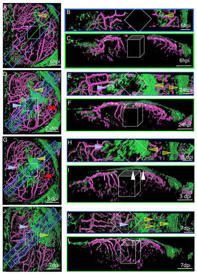 Surface laser injury of the optic tectum (OT) at 21 dpf. (A,D,G,J). Dorsal views. Blue rectangles: locations of horizontal sections in the right panels. Yellow lines: locations of XZ sections in the right panels. Anterior at the top. Midline on the left. (B,E,H,K) Horizontal thick sections. (C,F,I,L) XZ sections. (I). At 3 dpi, multiple layers of arachnoid cells are visible over the wound (white arrowheads). Putative injured zones: white squares and boxes. ARA-like cells: yellow arrowheads. MID-like cells: blue arrowheads. Fibroblast-like cells: red arrows. Scale bars: (A–L): 100 μm. (B,E,H,K): 50 μm.
