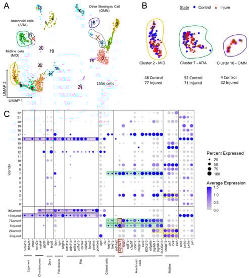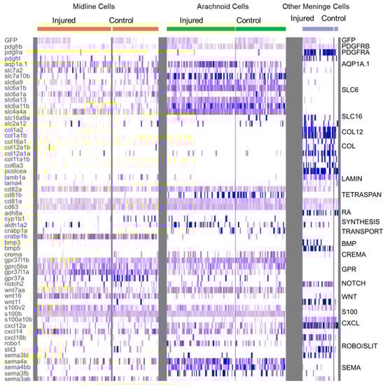 Various Wnt signaling molecules were expressed in cluster 2 (e.g., Wnt16) and cluster 7 (e.g., WNT7AA) (Figure 6). Wnt signaling may, thus, play a major role in repair, as in the spinal cord []. The sub-functionalization of the tissue-specific expression of CRABP1A and CRABP1B, two paralogs encoding retinoic acid transporters, has been reported in zebrafish []. We showed that cluster 7 displays an enrichment in CRABP1A, whereas cluster 2 cells strongly express CRABP1B [] (Figure 6). Cluster 2 appeared to be composed of midline roof plate cells (MID). Indeed, the Zic1 and Zic4 genes displayed strong enrichment in cluster 2 (Figure 5C). These genes are known to specify the midline roof plate during zebrafish development [,]. Other genes strongly expressed at the dorsal midline at 3 dpf, as shown by in whole-mount in situ hybridization (WMISH) data from the Zfin database, were found at the top of the list of enriched genes (Supplementary Figure S5A–L). One notable exception to the massive enrichment in collagen gene expression in another candidate meningeal cell cluster (C16, see below) was the strong expression of col5a2a in MID (Figure 6).