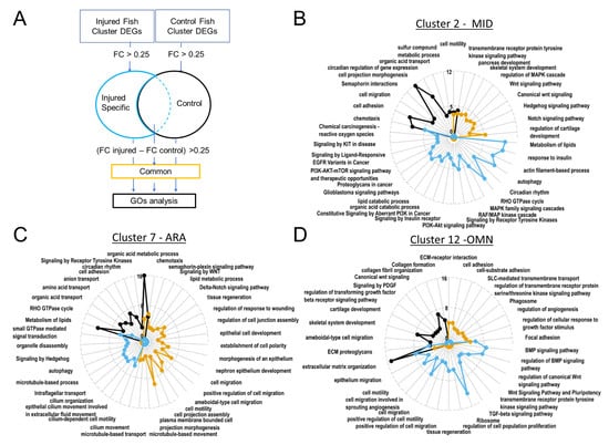 Gene ontology revealed upregulated biological processes. In ARA gene lists corresponding to genes specifically present in samples from injured fish, cilium-dependent cell motility GO and other cilium associated GOs are enriched. (A). Pipeline for filtering DEGs for GO analyses with Metascape. Radarplots of enriched Gene ontologies. Curves colored following types of filtering as explained in (A). Axis concern Zscore of GOs. Increased distance from the centre means higher significance. (B). OMN. (C). MID. (D). ARA.