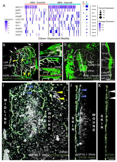AQP1a.1 ciliated ARA migrates towards the wound. (A) Expression of AQP1a.1 and cilia motility genes in cells depending on their status show overexpression of these genes after wounds. Genes expressed <10% of cells are not presented in dotplot. Adjusted p value (** <0.01 *** <0.001) concern markers in injured status. (B) Dorsal view on an uninjured OT with ARA (white arrows), MID (white arrowhead), and vessels (yellow arrowheads) stained by the AQP1a.1 antibody. Anterior at the top. Midline on the left. (C) Detailed dorsal view of ARA. (D) Detailed side view of ARA. (E) Detailed dorsal view of MID. (F) Detailed side view of MID. (G) At one dpi, strongly positive AQP1a.1 cells are visible over the wound (white arrowheads). (H) Strong and thick AQP1a.1 staining over the wound. (I) AQP1a.1-positive cells over and around the wound. Peripheral ARA-like cells: yellow arrowheads. (J) Migrating ARA stained by AQP1a.1: blue arrowheads. Lateral ARA: yellow arrowheads. (K) Migrating AQP1a.1-positive ARA are ciliated as shown by the GT335 staining: white arrowheads. AQP1a.1-positive cells do not exhibit any cilium/GT335 staining. Scale bars: (A,F): 100 μm; (B–E,G): 50 μm; (H–J): 10 μm.