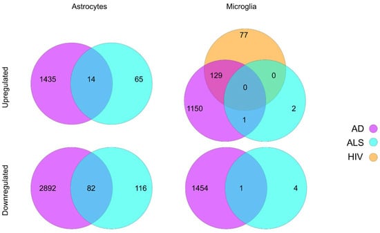Summary of differential gene expression in astrocytes and microglia reported in sc/snRNA-seq studies of ALS, AD, and HIV. Lists of differentially expressed genes were acquired from the respective papers and filtered based on the reported adjusted p value [,,,]. Upregulated genes were identified based on a log fold change or z-score greater than zero, while downregulated genes were identified based on a log fold change of z-score less than zero.