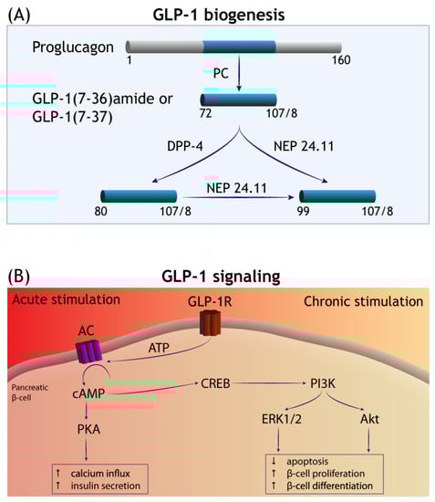 GLP-1 biogenesis and signalling transduction. (A) GLP-1 is liberated from the precursor molecule proglucagon—in the enteroendocrine L cells and in the CNS—by the isoforms of prohormone convertase (PC). GLP-1 (7–36)-amide and GLP-1 (7–37) are the major bioactive forms in circulation and degraded by the serine protease dipeptidyl peptidase (DPP-4) and neutral endopeptidase 24.11 (NEP 24.11). (B) The acute phase of GLP-1 receptor (GLP-1R) stimulation involves the activation of adenylate cyclase (AC) and a rise in the levels of intracellular cyclic (AMP), with subsequent engagement of additional effector mechanisms mediated by protein kinase A (PKA). This culminates in increased calcium influx and the promotion of insulin secretion by the islet β-cells. Long-term (chronic) stimulation of GLP-1R is thought to occur via cAMP-responsive element binding (CREB) signalling that promotes pro-survival gene expression mediated by the receptor tyrosine kinases PI3K/Akt and extracellular signal-regulated kinase (ERK)1/2, among others (see Introduction). In the pancreas, this increases β-cell mass by diminishing apoptosis and increasing β-cell proliferation and differentiation.