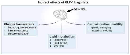 Indirect effect of GLP-1 receptor agonists (GLP-1RAs). Activation of central GLP-1 receptor signalling in the brain leads to metabolic reprogramming in the peripheral tissues. Shown are the effects on blood glucose homeostasis, lipid metabolism and gastrointestinal motility.