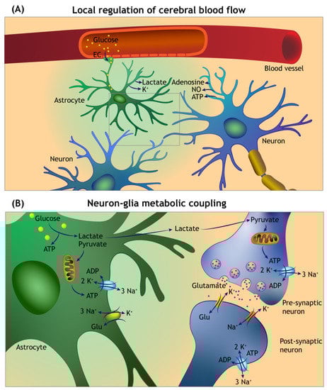 The energy supply to the brain is tightly linked with neuronal activity and these phenomena form the basis of neurovascular coupling, and can be directly monitored by acquiring information about the regional brain glucose utilisation through imaging modalities such as fMRI and positron emission tomography (PET) [,,]. Briefly, it is well established that task-dependent neural activity triggers an increase in the local cerebral blood flow (CBF) and glucose uptake in a pattern that is highly restricted to the activated network []. This stringent regulation is considered to be due to the lack of locally stored energy reserves that can be mobilised to meet the energy demands (except glycogen in astrocytes, elaborated below), as well as to remove by-products of neural activity (e.g., lactate, CO2, Aβ) and possibly for local temperature regulation [,,,,]. The physiological basis of functional hyperaemia (see Glossary) is thought to reflect a vasoactive effect on the brain capillaries by the local accumulation of metabolic by-products during synaptic activity (e.g., lactate, CO2, H+) and/or the active generation of vasodilatory mediators (e.g., NO—nitric oxide, adenosine, ATP, K+) [,,]. Moreover, glutamate released during synaptic activity raises intracellular calcium in astroglia through metabotropic mGluR5 receptors, with the subsequent stimulation of vasoactive arachidonic acid derivatives generation, which alters the tone of pericytes and vascular smooth muscle cells [,,,,]. Other studies also implicate neuronal ATP release with a subsequent rise in intra-astroglial calcium through the activation of purinergic P2X or P2Y receptors [,,].