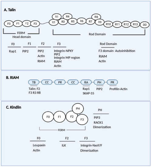 - Gingras, A.R.; Lagarrigue, F.; Cuevas, M.N.; Valadez, A.J.; Zorovich, M.; McLaughlin, W.; Lopez-Ramirez, M.A.; Seban, N.; Ley, K.; Kiosses, W.B.; et al. Rap1 Binding and a Lipid-Dependent Helix in Talin F1 Domain Promote Integrin Activation in Tandem. J. Cell Biol. 2019, 218, 1799–1809. [Google Scholar] [CrossRef] [Green Version]