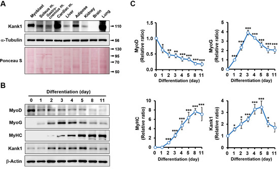 Expression profiles of Kank1 in murine tissues and myogenic differentiation. (A) Equal amounts (20 μg/lane) of protein were prepared from C2C12 myoblasts and adult male mouse tissues and subjected to SDS-PAGE (10%) and immunoblot analysis for Kank1. α-Tubulin was used as the loading control. Representative images are shown. (B) C2C12 cells were allowed to differentiate for 11 days. The expression of MyoD, MyoG, MyHC, and Kank1 was determined by immunoblotting. β-Actin was used as the loading control. (C) Expression levels in immunoblots were determined by densitometry and normalized versus ß-actin. Values are expressed as the relative ratio, with the intensity of differentiation on day 0 (MyoD and Kank1), day 1 (MyoG), or day 2 (MyHC) set to one. All results are presented as means ± SEMs (n > 3), and levels of significance are presented as *, p < 0.05; **, p < 0.01; ***, p < 0.001 vs. differentiation day 0.