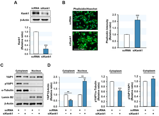 Depletion of Kank1 increased F-actin and nuclear YAP1. C2C12 cells were transfected with control (scRNA) or Kank1 siRNA (siKank1) at a concentration of 200 nM for 24 h. (A) Kank1 expressions were analyzed by immunoblotting and then intensities of densitometry were normalized versus ß-actin. Values are expressed as relative ratios versus scRNA control. (B) After transfection, cells were stained with FITC-phalloidin (green) and Hoechst 33,342 (blue) for the F-actin and nucleus, respectively. Scale bar: 25 μm. Phalloidin intensities were determined with ImageJ software. (C,D) The expressions of cytoplasmic and nuclear YAP1 and phosphorylated YAP1 (pYAP1) were analyzed by immunoblotting. The quality of subcellular fractions was verified with cytoplasmic (α-tubulin) or nuclear (lamin B2) markers. Values are shown as relative ratios versus scRNA control. All results are presented as means ± SEMs (n > 3), and levels of significance are presented as **, p < 0.01; ***, p < 0.001 vs. scRNA controls.
