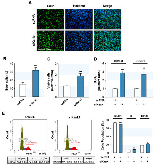 We next analyzed whether Kank1 depletion stimulates proliferation and cell cycle progression in myoblasts, since Kank1 knockdown increased nuclear YAP1 (Figure 2). C2C12 cell proliferation was assessed through EdU incorporation analysis and a cell viability assay 24 h after transfection with scRNA or siKank1. Based on EdU incorporation analysis, siKank1 significantly enhanced the percentage of EdU-positive myoblasts by 2-fold (Figure 3A,B). Similarly, the cell viability assay revealed that siKank1 enhanced the number of viable cells (Figure 3B). These results suggested that depletion of Kank1 promoted myoblast proliferation.