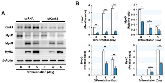 Depletion of Kank1 inhibited myogenic regulatory factor expression. C2C12 cells were transfected with control (scRNA) or Kank1 siRNA (siKank1) and differentiated for 5 days. (A) Representative immunoblots of Kank1, MyoD, MyoG, and MyHC on differentiation days 0, 3, and 5. (B) The band intensities of protein expressions were quantified using Evolution Capt software and normalized to ß-actin. All results are presented as means ± SEMs (n > 3), and levels of significance are presented as *, p < 0.05; **, p < 0.01; ***, p < 0.001 vs. scRNA controls.
