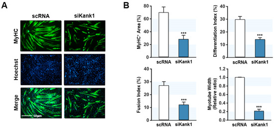 Kank1 knockdown impeded myogenic differentiation and myotube formation. C2C12 cells were differentiated for 5 days after transfection with control (scRNA) or Kank1 siRNA (siKank1). (A) Representative immunocytochemistry stained with MyHC antibody (green) and Hoechst 33,342 (blue). Scale bar: 50 μm. (B) MyHC-positive areas, differentiation indices, fusion indices, and myotube widths were determined as described in the Materials and Methods section. All results are presented as means ± SEMs (n > 3), and levels of significance are presented as ***, p < 0.001 vs. scRNA controls.