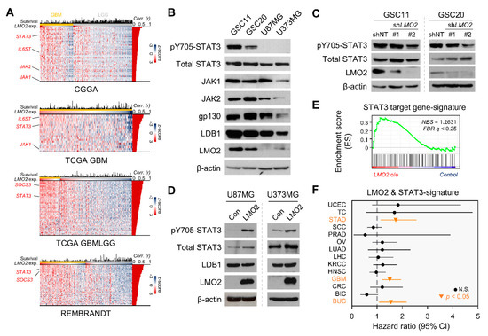 To evaluate the clinical significance of LMO2 and STAT3 signaling, we performed pan-cancer survival analysis with LMO2- & STAT3-signature in 14 tumor types from TCGA [34]. The high LMO2 & STAT3-signature had a prognostic value in three tumor types, namely, stomach adenocarcinoma (STAD), GBM, and urothelial bladder carcinoma (BUC), and had a positive correlation between LMO2-signature and STAT3-signature in these tumors (Figure 1F, Supplementary Figure S1E), (UCEC; uterine corpus endometrial carcinoma, TC; thyroid carcinoma, SCC; skin cutaneous carcinoma, PRAD; prostate adenocarcinoma, OV; ovarian serous cystadenocarcinoma, LUAD; lung adenocarcinoma, LHC; liver hepatocellular carcinoma, KRCC; kidney renal clear cell carcinoma, HNSC; head and neck squamous cell carcinoma, CRC; colorectal adenocarcinoma, BIC; breast invasive carcinoma). To determine whether the direct interaction of LMO2 with STAT3 is related to the transcriptional activity of STAT3, we performed co-immunoprecipitation (Co-IP) experiments using an anti-LMO2 antibody. The results showed that endogenous LMO2 did not co-precipitate STAT3 in GSCs (Supplementary Figure S1F). In addition, Co-IP analysis with anti-HA antibody showed that exogenous LMO2 did not bind to STAT3 in HEK293FT cells expressing HA-LMO2 (Supplementary Figure S1G). Taken together, our results showed that a correlation between LMO2 expression and STAT3 signaling was specifically observed in GSCs, but there was no physical interaction between LMO2 and STAT3.