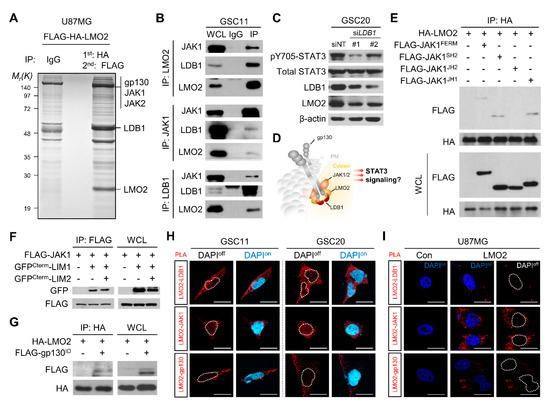 The LMO2-LDB1 Complex Regulates STAT3 Activity via Interaction with gp130 and JAKs. (A) Coomassie Brilliant Blue staining of affinity-purified protein from HA-FLAG-LMO2-expressing U87MG cells. LMO2-interacting protein bands were analyzed by LC-MS/MS. (B) Co-immunoprecipitation (Co-IP) of LMO2, JAK1, and gp130 in GSC11 cells IgG is the control antibody for Co-IP. Whole cell lysates (WCLs, lane 1) or immunoprecipitates generated with the indicated antibodies (lane 3) or a control IgG antibody (lane 2) were immunoblotted with the indicated antibodies. (C) Cell lysates of GSC20 cells transfected with either non-target siRNA or siLDB1 were immunoblotted with antibodies specific for pY705-pSTAT3, total STAT3, LDB1, LMO2, and β-actin. (D)A schematic diagram showing that LMO2 binds to LDB1, JAK1/2, and gp130. (E) A Co-IP experiment to identify the LMO2-interacting JAK1 domains (FERM, SH2, JH2, and JH1) in HEK293FT cells. HEK293FT cells were transfected with expression vectors encoding FLAG-JAK1FERM, FLAG- JAK1SH2, FLAG-JAK1JH1, and FLAG-JAK1JH2 together with HA-LMO2. The cell lysates were immunoprecipitated with an antibody against HA captured with agarose A/G beads and blotted using anti-FLAG and anti-HA antibodies. The expression levels were checked using 40 μg of WCLs and immunoblotted with the indicated antibodies. (F) A Co-IP experiment to identify the LMO2 domains that bind to JAK1 proteins in HEK293FT cells. HEK293FT cells were transfected with expression vectors encoding GFPCterm-LIM1 or GFPCterm-LIM2 together with FLAG-JAK1 (GFPCterm means GFP-encoding DNA sequence is fused with the C-terminus region of the gene of interest) The cell lysates were immunoprecipitated with an antibody against FLAG captured with agarose A/G beads and blotted using anti-GFP and anti-FLAG antibodies. The expression levels were checked using 40 μg of WCLs and immunoblotted with the indicated antibodies. (G) A Co-IP experiment was performed to identify whether the gp130 intracellular domains (ID) interact with LMO2 in HEK293FT cells. HEK293FT cells were transfected with an expression vector encoding FLAG-gp130ID and HA-LMO2. The cell lysates were immunoprecipitated with an antibody against HA captured with agarose A/G beads and blotted using anti-FLAG and anti-HA antibodies. The expression levels were checked using 40 µg of WCLs and immunoblotted with the indicated antibodies. (H) Proximity ligation assay in GSC11 and GSC20 cells. The cells were stained with the indicated antibodies. Representative images are presented. Nuclei were stained with DAPI. Red dots indicate the protein interaction signals. Scale bars: 20 µm. (I) Proximity ligation assay in U87MG cells expressing control or LMO2 proteins. The cells were stained with the indicated antibodies. Representative images are presented. Nuclei were stained with DAPI. Red dots indicate the protein interaction signals. Scale bars: 20 µm. See also Supplementary Figure S2C.