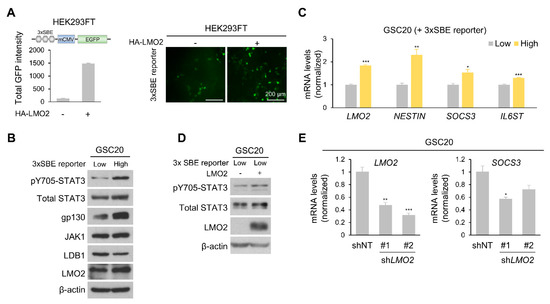 Embryonic stem cells and CSCs exhibit heterogeneity under in vitro culture conditions [39]. We hypothesized that the level of STAT3 activation varies in GSCs and correlates with LMO2. First, we constructed a STAT3 binding element (SBE) GFP reporter vector (3× SBE reporter) to detect STAT3 activation by the fluorescent signal intensity and transfected HEK293FT cells with a 3× SBE reporter vector in the presence or absence of the LMO2 expression vector. We observed a marked increase in STAT3 activation following LMO2 overexpression (Figure 3A). Next, we established a stable cell line of GSC20 cells expressing the 3× SBE reporter vector and sorted the cells into 3× SBE reporter-High and -Low cells. Immunoblot analysis showed that levels of pY705-STAT3, gp130, and LMO2 were higher in GFP-high GSC20 cells than in GFP-low GSC20 cells (Figure 3B). In addition, mRNA levels of LMO2, GSC marker (NESTIN), STAT3 target gene (SOCS3), and GP130 increased in GFP-high GSC20 cells (Figure 3C). Transfection of LMO2 in GFP-low GSC20 cells led to an increase in pY705-STAT3 expression (Figure 3D). The shRNA-mediated depletion of LMO2 in GFP-high GSC20 cells decreased SOCS3 mRNA expression (Figure 3E). Collectively, these data suggest that LMO2 plays a crucial role in STAT3 activation in GSCs.