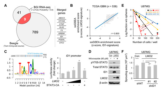 ID1, which is Elevated by LMO2-STAT3 Axis, Regulates Glioma Stem Cell (GSC) Properties. (A) Venn diagram showing overlapping genes between the 2-fold upregulated genes identified in the U87MG-LMO2 and glioblastoma-related genes searched by literature-based mining tool, Beegle [28] (https://beegle.esat.kuleuven.be/; search term: “glioblastoma”, accessed on 13 October 2019). Red: Merged genes. (B) Single-sample gene set enrichment analysis (ssGSEA) showed a positive correlation between LMO2-signature and ID1-signature in The Cancer Genome Atlas Glioblastoma (TCGA GBM) database. (C) Overview of binding sites for STAT3 in the promoter region 2200 bases upstream of the ID1 transcription start site (TSS, +1). HEK293FT cells were transfected with the ID1 promoter-driven luciferase reporter vector, together with an expression vector encoding constitutively active STAT3 and LMO2. Rectangle indicates increasing doses of the LMO2 expressing vector. Data are expressed as mean ± SEM. The two-tailed Student’s t-test was used to analyze the statistical significance between each group (n = 3 for each group). * p < 0.05, ** p < 0.01. (D) U87MG cells were transduced with either control or LMO2-expressing lentiviruses and exposed to nifuroxazide (60 µM) for 12 h. Cell lysates were immunoblotted with antibodies specific for pY705-STAT3, total STAT3, ID1, LMO2, and β-actin. (E) The tumorsphere forming ability of U87MG-control, U87MG-LMO2, and U87MG-LMO2-shID1 cells was examined using the limiting dilution assay. The two-tailed Student’s t-test was used to analyze the statistical significance between each group (n = 24 for each group). ** p < 0.01, *** p < 0.001 (n = 24). (F) Quantification of the spheroid sprouting area in U87MG-LMO2 cells transduced with either ID1 shRNA- or non-target shRNA-expressing lentivirus. Data are expressed as mean ± SEM. The two-tailed Student’s t-test was used to analyze the statistical significance between each group (n = 6 for each group). * p < 0.05, ** p < 0.01.
