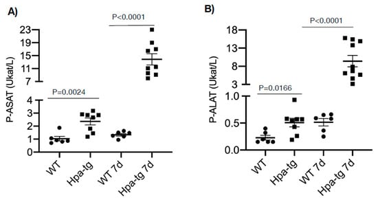 Plasma was collected from naïve and CCL4-treated mice and analyzed for p-ASAT (A) and p-ALAT (B) levels at the clinical biochemical laboratory, Akademiska hospital, Uppsala University. Higher levels of both enzymes were noted in naïve Hpa-tg vs. WT mice and even more so in CCL4-treated Hpa-tg vs. WT mice. (n = 6–10).