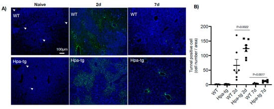 Hpa-tg and WT mice were treated with CCL4 mixed (1:3) with olive oil (intraperitoneal injection of 0.5–1.0 µL/g body weight on day 1 or days 1 and 4). Upon sacrificing the mice on days 2 and 7, plasma and livers were collected for biochemical and histological analyses. Clinical lab analyses revealed elevated levels of both ALAT (alaninaminotransferase) and ASAT (aspartataminotransferase) in the plasma of mice 7 days after CCL4 induction in both groups (Figure 1). The level of the enzymes was moderately increased in WT but markedly elevated in the Hpa-tg livers. Notably, naive Hpa-tg plasma contained significantly higher basal levels of both ALAT and ASAT compared with naïve WT plasma. Next, we examined the necrotic conditions of sections from paraffin-embedded liver tissues. Staining with anti-heparanase antibody confirmed overexpression of heparanase in the Hpa-tg liver, but its expression level did not show an obvious change upon CCL4 induction (Supplementary Figure S1). The endogenous heparanase in naïve WT liver was not detectable, nor in WT livers collected 2 days post-CCL4 stimulation. Heparanase was slightly elevated in WT livers 7 days post-stimulation (Supplementary Figure S1). H&E staining revealed large necrotic areas in livers collected 2 days after CCL4 stimulation (one injection) to a similar degree in both the WT and Hpa-tg livers (Figure 2). The damaged areas were substantially reduced in sections of WT liver 7 days after CCL4 stimulation, but not in the Hpa-tg mice, indicating a slower wound healing process in the Hpa-tg liver. This result was further confirmed by the Tunel assay. Massive apoptotic cells were detected in the livers of both groups 2 days post-CCL4 stimulation, with a significantly higher level in the Hpa-tg liver (Figure 3). The number of apoptotic cells was almost non-detectable in WT liver 7 days post-stimulation, in line with the H&E staining, implying a recovery process. In comparison, the Hpa-tg liver still contained a large number of apoptotic cells, demonstrating a slow recovery process.