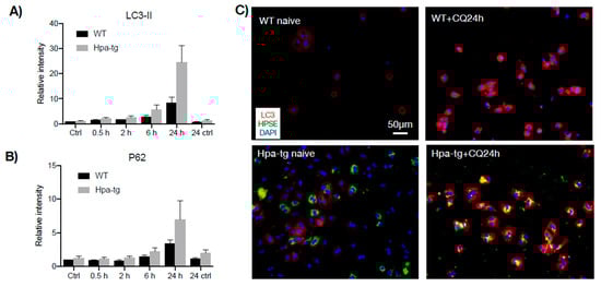 Autophagy in response to chloroquine. Hepatocytes isolated from naïve mouse liver were treated with chloroquine (CQ) to a final concentration of 20 μM and the cell lysates were subjected to Western blot analysis. (A) Quantification of LC3-II and (B) P62 levels (Western blot, Supplementary Figure S5) in cell lysates prepared at the indicated time points (20 µg total protein/lane). Band intensity was quantified by Image Lab software and the naïve WT value was set arbitrarily to a value of 1 (each bar represents the average band intensity; n = 5 mice per group). (C) Immunostaining of hepatocytes before and after CQ treatment. Note merged signals of LC3 and heparanase in the Hpa-tg cells.