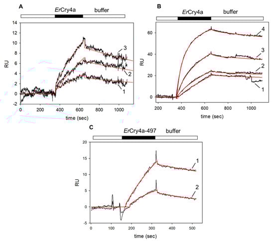 SPR recordings of ErCry4a interacting with the immobilized Gtα/Giα chimera. Black bars indicate the association phase, open bars indicate buffer flow. For all recordings, we observed that larger RU values resulted from the injection of higher ErCry4a concentrations. (A) Sensorgrams obtained after flushing of 50 nM (1), 100 nM (2) and 500 nM (3) ErCry4a over immobilized myristoylated Gtα/Giα, which led to the formation of an ErCry4a-Gtα/Giα complex. Global curve fitting (two-state-reaction model, red lines) resulted in an association rate constant ka1 = 3.32 × 103 M−1 s−1 and a dissociation rate constant kd1= 6.74 × 10−4 s−1, KD = 0.20 µM. (B) Binding of ErCry4a to non-myristoylated Gtα/Giα after flushing 5 nM (1), 10 nM (2), 20 nM (3) and 50 nM (4) ErCry4a over immobilized Gtα/Giα. Global curve fitting (two-state-reaction model, red lines) yielded the following constants: ka1 = 3.43 × 105 M−1 s−1; kd1 = 0.011 s−1 yielding a KD = 32 nM. (C) Injection of 500 nM truncated ErCry4a-497 over myristoylated (1) and non-myristoylated (2) Gtα/Giα, upper and lower curve, respectively. Curve fitting (red lines) to a Langmuir binding model yielded for the upper sensorgram: kass = 5.35 × 103 M−1 s−1; kdiss = 9.15 × 10−4 s−1; for the lower sensorgram: kass = 6.51 × 103 M−1 s−1; kdiss = 3.05 × 10−3 s−1.