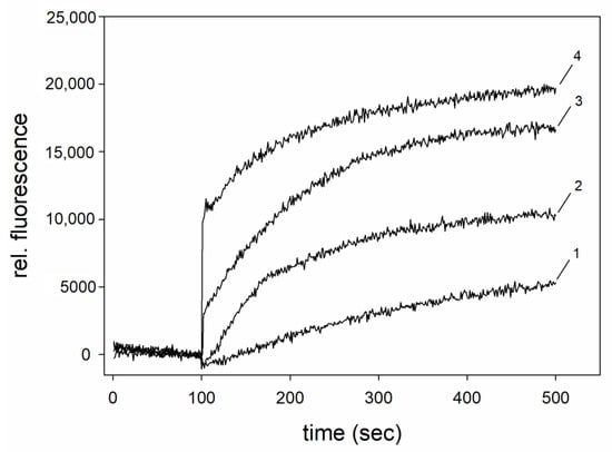 We verified that both Gtα/Giα variants purified by Ni-NTA affinity chromatography, anion exchange chromatography (AEC) and/or size exclusion chromatography (SEC) are functionally active by measuring their well-known conformational change in response to GDP/GTP exchange (Figure 3 and Figure S7). This conformational change is typical for G protein α-subunits and can be monitored by Trp fluorescence spectroscopy [34]. A unique Trp is conserved at or near position 207 in all α-subunits of heterotrimeric G proteins from vertebrates, and the corresponding position in ErGtα is 211. The addition of AlF4− to a purified Gα-protein with bound Mg2+-GDP leads to a protein conformational change resembling the transition to the active state, which is measured by an increase in Trp fluorescence emission [25,35,36]. We elicited the increase in Trp fluorescence emission by adding AlF4− and MgCl2. Figure 3 shows a concentration-dependent increase in Trp fluorescence emission, when AlF4− was applied to Gtα/Giα samples pre-incubated with different Mg2+-concentrations. Our results match previous recordings obtained with bovine rod outer segment Gtα and indicate that our Gtα/Giα chimera is an active protein [25,35] that might undergo a conformational change during the binding process (Figure 1). To corroborate the conformational changes in the presence and absence of AlF4−, we additionally carried out limited proteolysis of the Gtα/Giα chimera. The chimera Gtα/Giα was less susceptible to proteolysis in the presence of AlF4−, indicating a switch to the active conformation (Supplement Figure S7), which is in agreement with previous reports about bovine rod outer segment transducin Gtα [35,36].