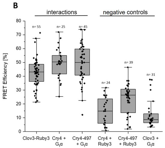 We observed a slightly higher false FRET background of mClover3-ErCry4-497 + mRuby3 compared to the other negative controls and a wider spread of the data in both groups, including mClover3-ErCry4-497, possibly due to differences in expression. Nonetheless, the mean value of the FRET efficiency of Gtα-mRuby3 with mClover3-ErCry4 with and without the C-terminus was nearly identical (49.7% versus 49.5%), supporting that the C-terminus is not involved in the interaction. The acceptor photobleaching technique tells us that ErGtα and ErCry4a and ErCry4a-497 are in close proximity to each other, indicating a protein–protein interaction.