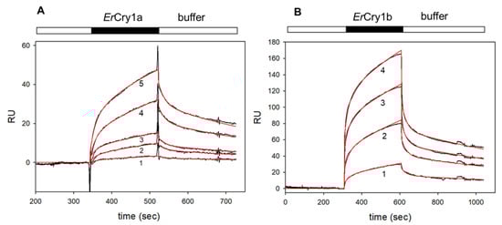 SPR recordings of ErCry1a and ErCry1b interacting with immobilized myristoylated Gtα/Giα. (A) Injection of increasing concentrations of ErCry1a, 25 nM (1), 35 nM (2), 50 nM (3), 70 nM (4) and 100 nM (5) yielded increasing amplitudes (sensorgrams 1–5). Global curve fitting using a two-state-reaction model gave a forward reaction rate ka1 = 1.3 × 105 M−1s−1 and a backward reaction rate kd1 = 5.27 × 10−2 s−1, KD = 0.4 µM. (B) Injection of increasing concentrations of ErCry1b, 50 nM (1), 150 nM (2), 300 nM (3) and 400 nM (4) yielded increasing amplitudes (sensorgrams 1–4). Global curve fitting using a two-state-reaction model gave a forward reaction rate ka1 = 2.17 × 104 M−1s−1 and a backward reaction rate kd1 = 3.32 × 10−2 s−1, KD = 1.53 µM.