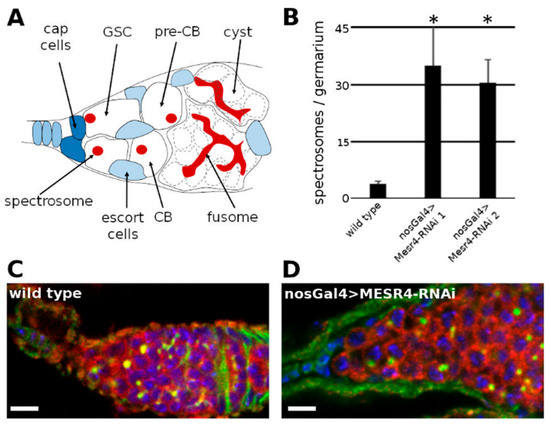 Stem cells are undifferentiated cells possessing the unique ability of unlimited cell division capacity. Stem cells can undergo symmetric or asymmetric mitotic divisions to accomplish the dual task of self-renewal and the generation of differentiated cells [1]. The symmetric division of a stem cell can produce only stem cell daughters in some divisions and only differentiated daughters in others. This way, the number of stem cells can expand during development or regeneration while maintaining the balance between stem cells and differentiated cells. Upon asymmetric mitosis of a stem cell, however, one of its daughters remains in the stem cell state to maintain the undifferentiated stem cell pool, while the other daughter cell starts to differentiate to support developmental processes or to ensure tissue homeostasis [2]. The better understanding of the mechanisms behind the decision between self-renewal and differentiation is a key question in stem cell biology. The regulation of the Drosophila female germline stem cells (GSCs) provides an excellent model for studying stem cell maintenance and differentiation processes [3,4,5]. In the Drosophila females, a population of GSCs is located in the niches at the anterior tip of the ovary [6]. Each GSC divides asymmetrically and generates a daughter cell staying anchored at the tip of the niche and remaining in the GSC state, while the other daughter cell becomes a pre-cystoblast (pre-CB) committed to differentiate [7,8]. After mitosis, the GSC and the newly formed pre-CB remain physically connected due to an incomplete cytokinesis. The thin cytoplasmic connection is abscised in the G2 phase of the subsequent cell cycle [9,10,11]. The pre-CB then starts to differentiate and becomes a cystoblast (CB) which undergoes four synchronous, incomplete divisions, and gives rise to a sixteen-cell cyst. One cell of the sixteen-cell cyst matures to an oocyte, and the others differentiate into nurse cells. The differentiation state of the germ cells can be easily followed by visualizing specific cytoplasmic organelles. GSCs, pre-CBs and CBs contain a dot like cytoplasmic organelle, the spectrosome, while the cyst is marked by a branched structure, called the fusome (Figure 1A).