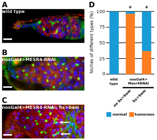Rescue of MESR4 silencing by forced bam expression. (A–D) Immunostaining a wild type (A) and a tumorous nosGal4 > MESR4-RNAi niche (B). Rescue of the niche defects in a nosGal4 > MESR4-RNAi; hs > bam niche after heat shock (C). Fusomes of differentiated germ cells are indicated by white arrows. Spectrosomes and fusomes are labelled with HTS (green); germ cells are labelled for Vasa (red); DAPI is blue. Scale bars: 10 µm. (D) Quantification of niche phenotypes of wild type (n = 27), nosGal4 > MESR4-RNAi (n = 25) and nosGal4 > MESR4-RNAi; hs > bam (n = 27) niches. “Normal” niches contain 1 to 6, “tumorous” niches contain more than 6 spectrosome containing germ cells. For statistical analysis, the Chi-square test was used, * p < 0.05.