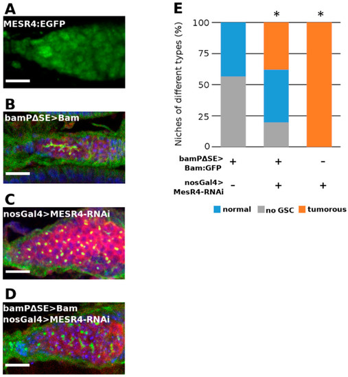 Next, we silenced MESR4 with the bamGal4 driver, which is specifically active in the differentiated CBs reflecting the expression pattern of the endogenous bam gene. In the bamGal4 > MESR4-shRNA ovaries, no tumorous niches were found, indicating that MESR4 is not required in bam expressing CBs (Figure S2A,B). Based on these data, we hypothesized that MESR4 functions upstream of bam to promote GSC differentiation. To validate our argument, we performed a genetic rescue experiment using the hs-bam transgenic line. Forced expression of bam from the heat shock inducible hs-bam transgene induced differentiation of the MESR4-RNAi germ cells. Following heat shock, fusome-containing cysts were formed in the nosGal4 > MESR4-shRNA; hs-bam niches (Figure 3B,C). Forced expression of bam resulted in the reduction of the number of GSC-like tumors (37.0% in nosGal4 > MESR4-shRNA; hs-bam, n = 27 vs. 96.3% in nosGal4 > MESR4-shRNA, n = 25) (Figure 3D). In summary, MESR4 regulates the differentiation in the committed GSC daughter cells by promoting bam expression.