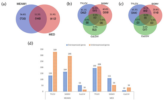 Differentially expressed genes (DEGs) in Bemisia tabaci Middle East-Asia Minor 1 (MEAM1) and Mediterranean (MED) adults provided with an acquisition access period of 72 h on TYLCV-infected versus non-infected tomato plants, SiGMV-infected versus non-infected prickly sida plants, or CuLCrV-infected versus non-infected squash plants: (a) Normalized Venn diagram showing unique and common DEGs in B. tabaci MEAM1 and MED adults after the acquisition of TYLCV, SiGMV, or CuLCrV; (b) Normalized Venn diagram showing unique and common DEGs in B. tabaci MEAM1 adults after the acquisition of TYLCV, SiGMV, or CuLCrV; (c) Normalized Venn diagram showing unique and common DEGs in B. tabaci MED adults after the acquisition of TYLCV, SiGMV, or CuLCrV; (d) Number of DEGs in B. tabaci MEAM1 and MED detected between viruliferous (TYLCV, SiGMV, or CuLCrV ) and non-viruliferous insects.