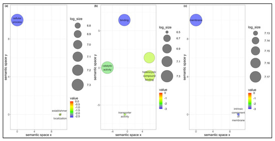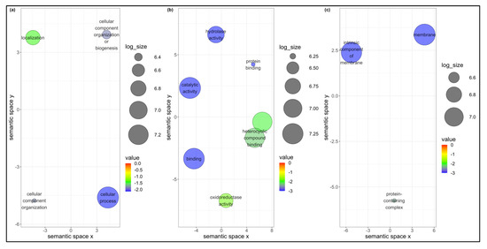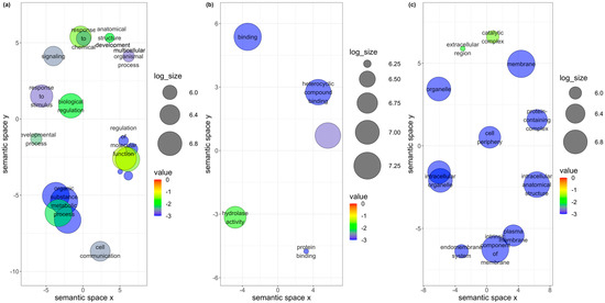 Scatterplots showing (a) biological process, (b) molecular function, and (c) cellular component gene ontology terms for Bemisia tabaci Mediterranean following the acquisition of viruses. Cluster representatives in a two-dimensional space were derived by applying multidimensional scaling to a matrix of the gene ontology terms’ semantic similarities. Bubble color indicates the p-value, and size indicates the frequency of the GO term in the underlying GOA database.