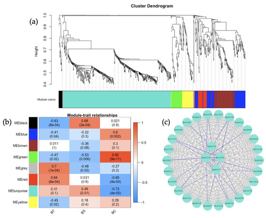 Bemisia tabaci Middle East-Asia Minor 1 (MEAM1) adults weighted gene co-expression network analysis. (a) Dendrogram clustering showing eight modules of co-expressed genes. A total of 784 genes are represented in this network, with 454 genes belonging to MEturquoise. (b) Heatmap showing the correlation of module eigengenes in relation to B. tabaci MEAM1 that acquired TYLCV (BT), SiGMV (BS), or CuLCrV (BC). (c) Top 30 genes from MEturquoise with connectivity lines (blue) associated with the top 5% of the connected genes.