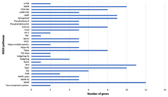KEGG pathways pertaining to signal transduction identified in viruliferous Bemisia tabaci Mediterranean. The number of differentially expressed genes involved in each pathway are displayed on the x-axis.