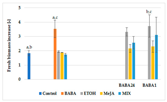 Fresh biomass increase of hairy roots cultivated under various culture conditions: control—untreated roots collected at day of inoculation (day “0”); BABA—roots treated with 100 µM β-aminobutyric acid (BABA) for 14 days; ETOH—roots treated with ETOH for 14 days without BABA, and variants: treated 24 h or 1 week with BABA with subsequent addition of ETOH for 14 days; MeJA—roots treated with MeJA for 14 days without BABA, other variants: treated 24 h or 1 week with BABA with prior to addition of MeJA for 14 days; MIX—roots cultivated for 14 days without BABA, and variants: treated 24 h or 1 week with BABA with subsequent addition of MIX of elicitors. Data represent mean values ± SD from three independent experiments. Data within groups denoted with the same letters are statistically significant (p ˂ 0.05).