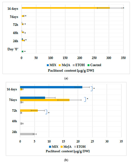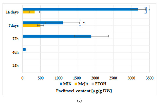 In culture variants without BABA, the highest paclitaxel content was determined after a 14-day-long elicitation with MeJA (303.1 ± 42.5 µg/g dry weight, DW), which was over 58-fold more than in the control (5.18 ± 1.7 µg/g DW) (Figure 2a). While under treatment with MIX, paclitaxel was detected only up to 72 h of culture, with its highest content noted after 24 h of elicitation. Nevertheless, it was a 2.4-fold lower concentration than after MeJA elicitation at the same time point (Figure 2a). The BABA applied alone, irrespective of duration of treatment, had no effect on paclitaxel biosynthesis. Medium supplementation with only ETOH did not induce paclitaxel production, in contrast to its application after 24 h of BABA treatment, where paclitaxel production was observed. Under those conditions, its highest yield was noted after 24 h, and decreased subsequently (Figure 2b). Among other BABA24 variants, BABA24MIX was the most favourable for paclitaxel accumulation, although its presence was detected for the first time on the 7th day of treatment, while its highest content amounted to 21.5 ± 2.5 µg/g DW, noted on day 14. In the BABA24MeJA variant, paclitaxel biosynthesis started after 72 h of culture and its highest yield (17.1 ± 4.0 µg/g DW) was achieved on day 7, which was then followed by a significant decline in its concentration. In the BABA1 variants, paclitaxel biosynthesis was determined only after elicitor/s addition. In the BABA1MeJA cultures, paclitaxel content was detected for the first time after 7 days of elicitation. At the same time point, it reached its maximum concentration of 495.7 ± 86.3 µg/g DW. In the BABA1MIX variant, paclitaxel accumulation started after 72 h of culture and rose up gradually up to 3179.9 ± 211.9 µg/g DW on day 14. It was the highest paclitaxel content determined under the conditions of the current study, over 613-fold higher than in control and over 6-fold higher than in the BABA1MeJA variant at its peak (495.7 ± 86.3 µg/g DW) (Figure 2c).