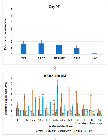 In the control culture, the expression of early- as well as late-pathway genes was at a parallel level, with the lowest expression showed by rolC (Figure 3a). BABA affected the levels of BAPT and rolC genes the most (Figure 3b), however, they did not follow the same expression pattern, and, in addition, the correlation between them was negative (r = −0.01). The highest BAPT transcript level was noted 72 h after BABA addition, while for rolC it was after 24 h. For further experiments with BABA, two time points were chosen for elicitor supplementation, i.e., 24 h and 1 week. Relative expression levels of genes of interest between these time points did not differ significantly (p < 0.05), and they were also not significantly different than at other examined time points.
