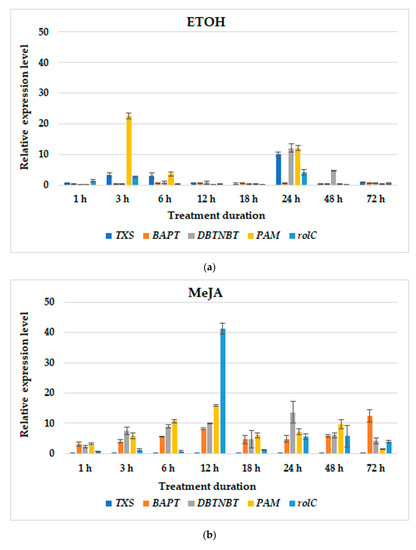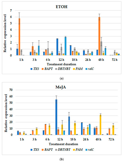 Paclitaxel production was observed when the medium was supplemented with elicitor/s (Figure 2a). If the influence of ETOH on paclitaxel accumulation was taken into consideration, it was revealed that its content was detected only in the BABA24E variant, and in low quantities (Figure 2b), so it could be assumed that the effect of ETOH on paclitaxel biosynthesis could be irrelevant. In variants supplemented with BABA, it was demonstrated that the duration of preconditioning had a significant impact on paclitaxel productivity. The highest paclitaxel concentration was detected after a two-week elicitation in BABA1MIX variants, which corresponded to the highest expression levels of TXS and BAPT genes. DBTNBT, PAM and rolC transcript abundance was higher in the BABA1MeJA variant, in which BAPT expression was on a parallel level with the BABA1MIX variant, while TXS expression was very low (Figure 5 and Figure 6). The activity of the TXS gene, committing the first step of taxane biosynthesis, was claimed not to be rate-limiting on taxane biosynthesis [15,16], which also found confirmation under the conditions of the present study. The results of the current investigations seem to confirm that among all investigated genes herein, BAPT could play an essential role in taxane productivity (which was previously postulated [15,16,34]), but also, PAM upregulation could affect paclitaxel biosynthesis capacity.