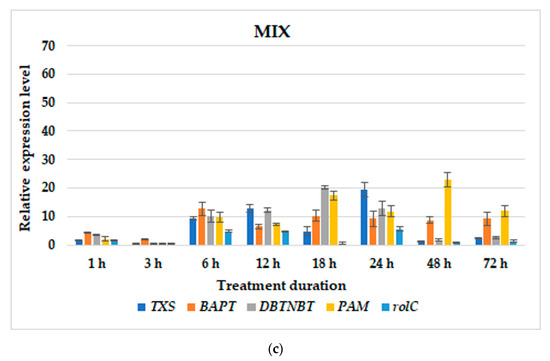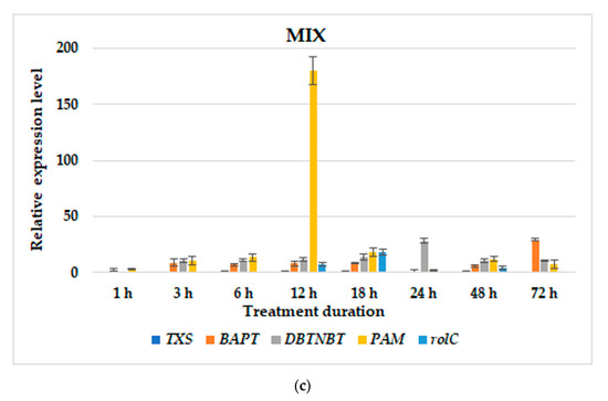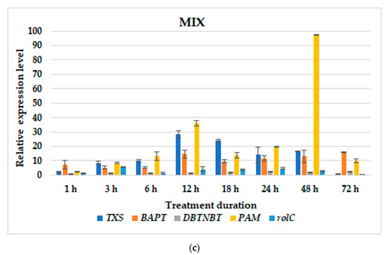 In culture variants without BABA, ETOH added individually caused an increased in steady-state transcript levels. The most affected were TXS, DBTNBT and rolC after 24 h, and PAM, which peaked twice after 3 and 24 h (Figure 4a). However, these inductions of gene expression were not translated into paclitaxel production (Figure 2a). MeJA elicitation caused a rise in the gene expression levels of almost all genes investigated, except TXS. The coincidence in the highest transcript abundance was observed in the expression levels of PAM and rolC. BAPT peaked after 12 h of treatment, although the maximum expression was noted after 72 h. Meanwhile, the maximum level of DBTNBT expression was detected at 24 h post-elicitation (Figure 4b). These enhancements in transcript abundance reflected the capacity in paclitaxel accumulation, which was the highest among these culture variants (Figure 2a). In the hairy roots elicited with MIX, the significant induction of late-pathway genes was determined with the highest PAM transcript abundance 12 h after the addition of elicitors (Figure 4c). The expression of rolC was also remarkably affected; however, its levels were over 2-fold lower than under MeJA added as a single elicitor.