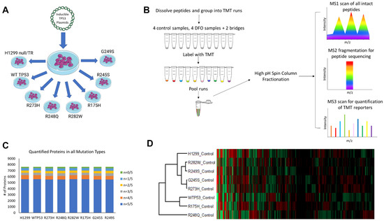 To obtain a broad and representative overview of the mutant TP53 proteome, we measured the impact of inducing the expression of the most common TP53 mutations in human cancer in great depth using an advanced TMT-based proteomics workflow. We started with TP53 null H1299 cells, and then transfected these cells with a plasmid containing wild-type TP53, or one of the six most commonly expressed TP53 mutation types. These mutation types were selected because they represent nearly 25% of all the TP53 mutations expressed in human cancers. Next, to determine how mutant TP53-expressing cells maintain iron homeostasis in response to reduced iron availability, we treated each of these cell lines with the potent iron chelator, deferoxamine (DFO). From a total of 80 samples (5 control samples and 5 DFO samples from each cell type), proteins were isolated by boiling and sonication in buffered guanidine, quantified by bicinchoninic acid assay, trypsinolyzed, and subjected to orthogonal chromatography [19,20]. Our aim was to compare changes in protein expression among the cell lines and treatments. Thus, each sample was labeled with tandem mass tags, pooled, and fractionated, and then each fraction was analyzed by liquid chromatography-tandem mass spectrometry (LC-MS/MS). Peptide ions were analyzed using a “Top-Speed” data-dependent MS3 method. Peptides were identified and protein ratios were measured by database searching using MaxQuant v2.0.3.0. Applying a strict peptide and protein false discovery rates of 1%, we identified 105,488 total peptides, which includes 85,165 unique peptides that were assigned to 7625 protein groups. We quantified on the basis of uniques and razors, using protein grouping and principles of parsimony. Our workflow quantified 5165 proteins that were present in each of the 80 samples, 5181 proteins in each of the untreated control cells, and 5171 proteins in each of the DFO-treated cell lines (Figure 1).