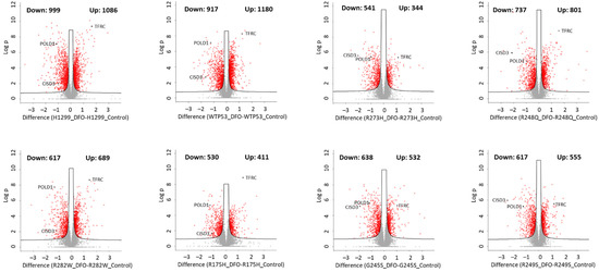 To identify candidate pathways impacting iron metabolism and iron homeostasis downstream of wild-type and mutant TP53, we performed quantitative proteomics analyses on the LS-MS/MS data from each DFO-treated TP53 null, wild-type TP53, and mutant TP53 cell line compared to their respective untreated controls. As expected, all cell types exhibited changes in gene expression consistent with the induction of iron deficiency. DFO induced strong perturbations in the proteomes expressed in all cell types (Figure 2). The expression of the iron uptake protein, transferrin receptor (TFRC) was amongst the most highly upregulated proteins and was increased 2–3-fold in all cell types, whereas iron-containing proteins such as CDGSH iron sulfur domain 3 (CISD3) and DNA polymerase delta 1 (POLD1) were amongst the most downregulated. In both the TP53 null and wild-type TP53-expressing cells, DFO treatment resulted in the upregulation of over 1000 other proteins and downregulation of more than 900 proteins (Figure 2). Thus, the vast majority of DFO-induced changes in protein expression are largely TP53 independent. In contrast, DFO treatment of mutant TP53-expressing cells impacted a significantly lower total number of proteins than that observed in TP53 null or wild-type TP53-expressing cells (Figure 2). These findings are consistent with the notion that mutant TP53 expression significantly influences the way cells respond to changes in iron availability.