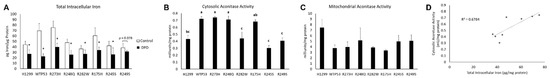 Mutant TP53 expression influences intracellular iron availability and the activity on iron-containing enzymes. (A) Total intracellular iron in cells expressing distinct TP53 mutation types under control conditions and following treatment with 50 µM DFO for 48 h. (B) Cytosolic (C) and mitochondrial aconitase activity in cells expressing distinct TP53 subtypes. (D) Cytosolic aconitase activity is directly correlated to levels of intracellular iron under control conditions. * Denotes statistical difference from respective control, p < 0.05. Superscripts (a, b, c) denote statistical difference between TP53 subtypes. Subtypes with the same superscripts are not statistically different. Error bars indicate SEM.