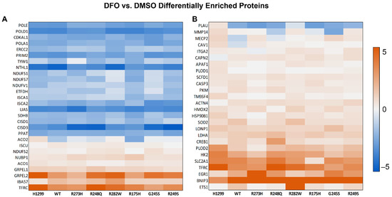 Cells expressing distinct TP53 mutation types exhibit similar protein expression pattern changes in response to iron restriction. (A) Differential protein expression summary for proteins with annotated functions in Fe-S cluster biogenesis and (B) the cellular response to hypoxia from cells described in Figure 1. Legend scale is the ratio of the log2 fold-change (DFO/DMSO).