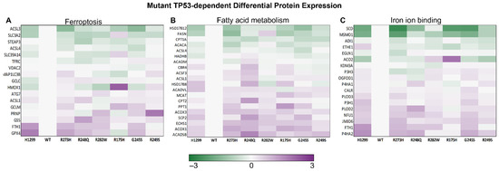 Mutant TP53 expression influences basal levels of protein expression that can directly and indirectly influence iron homeostasis. (A) Differential protein expression summary for proteins with annotated functions in ferroptosis, (B) fatty acid metabolism, and (C) iron ion binding from control cell lines described in Figure 1. Legend scale is the ratio of the log2 fold-change (wild-type TP53-expressing cells (WT) and cells expressing the indicated TP53 mutant).