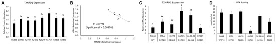 One of the hallmarks of ferroptosis is loss of lipid peroxide repair, which leads to the toxic accumulation of lipid reactive oxygen species (ROS) [1]. Thus, we were intrigued by the finding that glutathione peroxidase 4 (GPX4) expression was modestly upregulated in most mutant TP53-expressing cells, except for the R175H mutants (Figure 5A). GPX4 is the central antioxidant enzyme for protection against lipid peroxidation during ferroptosis, and its loss is sufficient to induce ferroptosis in many cell types [21]. Selenoprotein thioredoxin reductase 1 (TXNRD1) has been proposed to cooperate with GPX4 to protect against ferroptosis, but TXNRD1 protein expression has also been shown to negatively affect GPX4 expression in some contexts [22]. Similarly, we observed that TXNRD1 expression was highest in the R175H TP53-expressing mutants (Figure 6A), and that TXNRD1 expression was inversely correlated with GPX4 expression in all of the analyzed TP53 subtypes (Figure 6B).