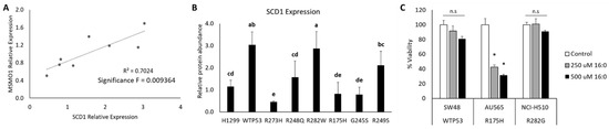 Another hallmark of ferroptosis is the oxidation of polyunsaturated fatty acid (PUFA)-containing phospholipids [1], whereas monounsaturated fatty acids (MUFAs) can promote a ferroptosis resistant state [21]. Thus, stearoyl-CoA desaturase 1 (SCD1) stood out because of its essential role in saturated fatty acid desaturation and its iron binding properties (Figure 5C) [22,23]. Previous research has shown that, in cancer, SCD1 protein expression positively correlates with methylsterol monooxygenase 1 (MSMO1) expression and can confer ferroptosis resistance [22]. We also observed a statistically significant positive correlation between SCD1 and MSMO1 protein expression (Figure 7A). The highest levels of SCD1 protein expression were found in the WT TP53 and R282W TP53-expressing mutants (Figure 7B). These findings expand upon our previous work demonstrating that cells expressing these two TP53 subtypes are less sensitive to ferroptosis compared to TP53 null and other mutant TP53-expressing cell lines [8].