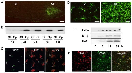 Microglia in the axotomized facial nucleus. (A) The response of the microglia to motoneuron injury. The right facial nerve of adult rats was cut and after 5 days, the cryosections of the brainstem were stained by anti-Iba1 antibody. Ct: control nucleus; Op: axotomized nucleus. Scale bar = 400 µm. (B) Time-course changes of Iba1 levels. Control nucleus (Ct) and transected nucleus (Op) taken at 1, 3, 5, 7, and 14 days post-insult were analyzed for Iba1 in immunoblotting. (C) Mitotic microglia in the axotomized facial nucleus. The axotomized facial nucleus in the brainstem sections prepared at 3 days post-insult was dually stained by anti-PCNA antibody (PCNA) and anti-Iba1 antibody (Iba1). A merged photo is shown at the right. Scale bar = 50 µm. (D) The morphology of the microglia in the control and axotomized facial nucleus. Coronal brainstem sections taken at 5 days post-insult were stained by the anti-Iba1 antibody. Microglia in the control nucleus (Ct) and axotomized nucleus (Op) are shown. Scale bar = 50 µm. (E) The ability of microglia to induce inflammatory cytokines. Primary microglia (2 × 106/dish) were stimulated with lipopolysaccharide (LPS) and the conditioned media were recovered at 0, 6, 12, and 24 h post-stimulation. Each conditioned medium was analyzed by immunoblotting for TNFα, IL-1β, and IL-6, respectively. (F) The transformation of microglia into phagocytes. The right facial nerve of the P2 neonatal rats was axotomized and 3 days later, the brainstem cryosections were prepared. The axotomized facial nucleus was dually stained by anti-Iba1 antibody (Iba1) and anti-CD68 antibody (CD68). A merged photo (merged) is shown at the right. Scale bar = 50 µm.