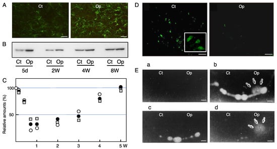 In the normal adult brain, microglia maintain a ramified form with a small soma and a few long prolongations with short and fine projections, but when the brain is injured or diseased, they retract the processes and increase the volume of the cell body, forming activated microglia or reactive microglia [107,108,109]. Starting with del Rio Hortega, many researchers have reported that microglia change their morphology in response to various pathological events [110]. We can observe the morphological change of microglia by means of a facial nerve axotomy model. In the control facial nucleus, microglia remain ramified with some angular long processes (Figure 2D, Ct). These microglia are thought to assume this cellular state in order to sense changes in the environment [1]. On the other hand, in the axotomized nucleus, we can see activated microglia having enlarged and irregular cell bodies with short processes, if any (Figure 2D, Op). This form is thought to be an active state that is adopted to deal with an abnormal alteration in the tissue environment.