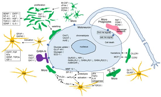 When triggered by motoneuronal lesions, microglia and astrocytes become activated and alter their morphology, mitotic activity, and functional state. Inhibitory GABAergic neurons are also induced to change their functional characteristics in response to motoneuronal lesions. What molecules mediate the interaction between the injured motoneurons and the cellular surround? Injured motoneurons are assumed to output a certain stimulus to the cells surrounding them. One group suggested that altered electrophysiological signaling is among the stimuli emitted from neurons early after injury [284]. Motoneuron-derived calcitonin gene-related peptide (CGRP) was thought to be a probable molecule in the mediation of this interaction [285]. In fact, CGRP was documented to activate microglia and astrocytes [264]. ATP released from injured neurons [286], ATP released from neurons in an activity-dependently manner [287,288], and adenosine [289] are also candidates for neuronal stimuli. Chemokines and their cognate receptors are able to mediate between motoneurons and glial cells. Fractalkine-producible motoneurons can gather CX3CR1-expressing microglia [290]. The immune regulator CD200 is expressed in neurons, and the specific receptor CD200R is expressed in microglia/macrophages [291,292], suggesting that neurons have the ability to activate microglia through the association between CD200/CD200R.