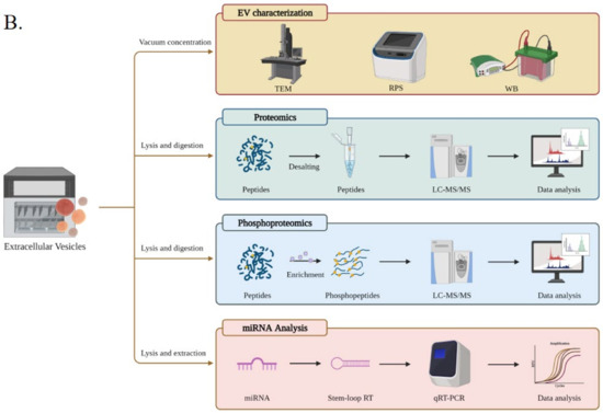 (A) schematic overview of the automated EV isolation workflow, including the incubation, washing, and elution steps. (B). Downstream EV analyses include EV characterization, EV proteomics, phosphoproteomics, and miRNA detection.