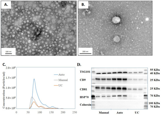 To evaluate the performance of EVrich relative to the existing methods for EVs capture, we performed EV isolation and characterization by automated EVrich, EVtrap manual, and UC. First, according to the TEM images (Figure 2A,B), the EVs isolated by the automated EVrich process demonstrated good size integrity, ranged in diameter from 50 to 150 nm, and showed a uniform spherical structure with a few impurities. Samples exhibited typical characteristics of extracellular vesicles [20]. Figure 2C shows the RPS results of the three EV samples collected by manual EVtrap, automated Evrich, and UC. The result shows that EVrich might extract more small size (under 200 nm) EVs than manual or UC. According to the results from EVrich extraction, the number of particles below 200 nm is basically 10 times that of 200–500 nm particles, which is much higher than that of manual extraction and UC samples (Figure S2). Where the result is interesting, the exact cause for isolating more small-sized EVs is unclear and requires further investigation. Subsequently, the presence of the common EV marker TSG101, CD9, CD81, HSP70, and the absence of negative control Calnexin were validated by performing western blot analysis (Figure 2D). The band intensity from Evrich isolation was similar to that of the manual group but significantly higher than that of the UC group. The smaller intragroup variability of the TSG101, CD9, CD81, and HSP70intensity in the automated group indicates the reliability and stability of the EVrich capture process. Calnexin is an endoplasmic reticulum protein, and Calnexin was not detected by the three methods, indicating that there was no protein contamination from cells in the extracted samples. In summary, the automated EV capture provides greater capture efficiency than UC while showing greater reproducibility and smaller variation than the manual operation.